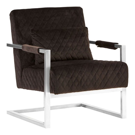 Diamond patterned stitching textures the cushion of this contemporary statement chair. FEATURES : Material : Metal, Nylon, Pine Wood, Polyester, Rubber, Foam Finish : Black, Chrome The thick padded cushion and backrest of the Gatbit chair are supported by an angular frame made from brushed chrome Its smooth, reflective surface contrasts with the geometric quilted design of the luxuriously rich black velvet Removable armrests and a coordinating rectangular cushion enhance the comfort of this statement chair Available at an affordable price Images shown are for illustration purpose only DIMENSIONS : Height : 84cm Width : 71cm Depth : 79cm